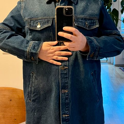 Jeans-merkkinen farkkutakki L. 77 % puuvillaa, 21 % polyesteria, 1 % viskoosia, 1 % elastaania. Kahdet taskut. Pituus olka-helma 52 cm.