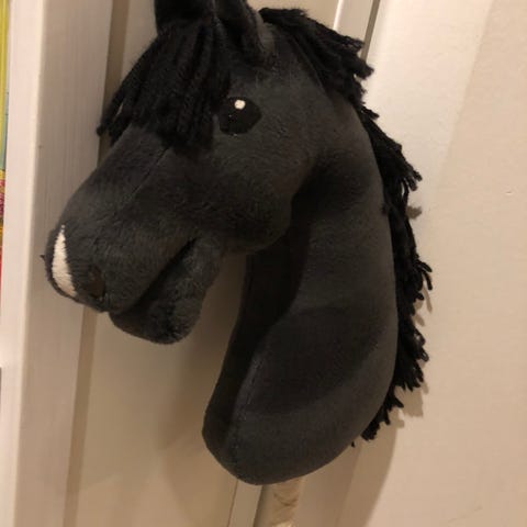 Itsetehty vaalea keppihevonen. Mukana vaaleanpunaiset suitset ja loimi. Nouto Viertola.