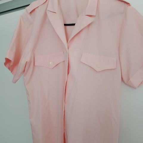 Tämä on kotiompelijan tuote ja koko on suuntaa antava. Puserosta löytyy olkatoppaukset. Pari alinta nappia uupuu ja sivusaumojen koristenapit vaativat kiristelyitä. Pituus on puoleen reiteen ja hihat tulevat hieman kyynärpäiden yli. Kivan näköinen päällä vyön kanssa.