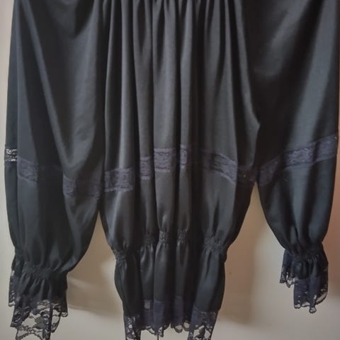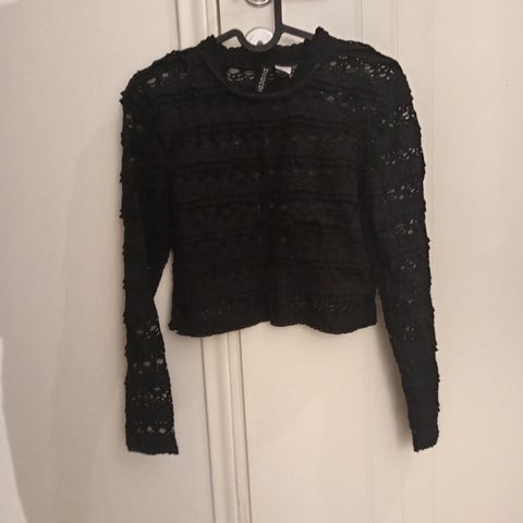 Tummansininen pitsikuvioitu pusero koko L. Puseron etupuoli pitsiä ja takapuoli trikoota. Vyötäröllä solmimisnauhat.