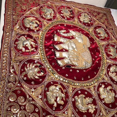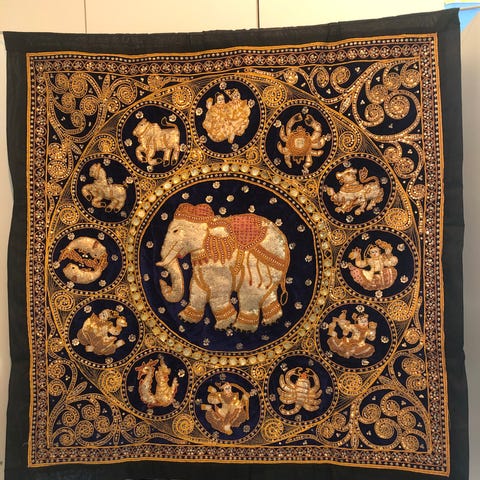 Kuvanmukainen ,käytetty mutta siistikuntoinen seinävaate Thaimaasta.Osittain kohokuvioinen ,esim. isot norsut.