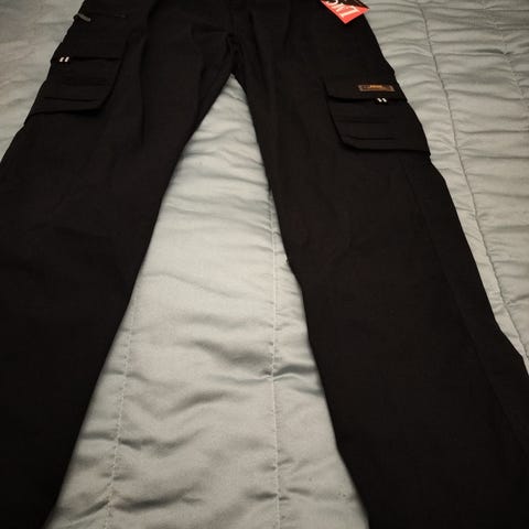 Kunnolliset housut syksyyn ja talveen. Paljon taskuja ja joustava vyötärönauha. Lahkeissa kiristysnarut. Merkki Finnature.