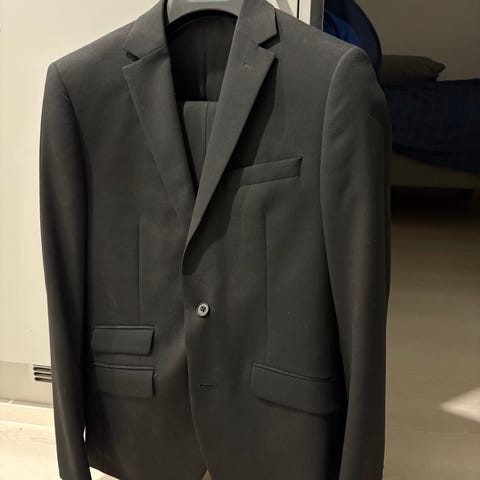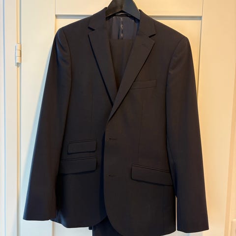 Myytävänä todella tyylikäs Riley-merkkinen slim-mallinen tummansininen puku. Ollut käytössä yhdeksänluokkaisella pojalla n. 160-165cm.