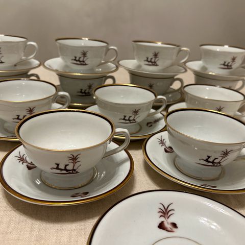 Arabia Diana kahvikalusto, valmistettu posliinista. Sisältää kahvikuppeja, lautasia, sokerikko, kermakko ja tarjoilulautanen. Koristeena kultareunus ja koristemaalaukset. Sopii kahvin ja teen tarjoiluun.
