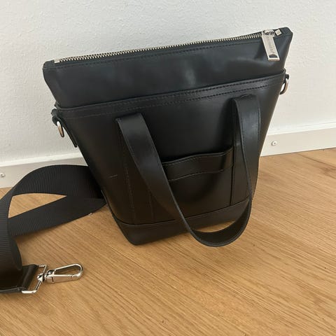 Säädettävä olkahihna ja kaksi kantokahvaa. Vetoketjusuljenta ja ulkona yksi pieni avotasku.