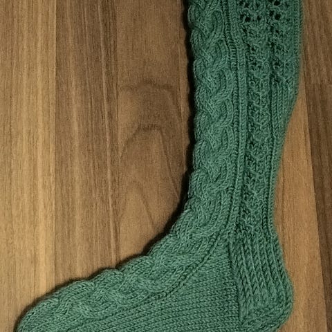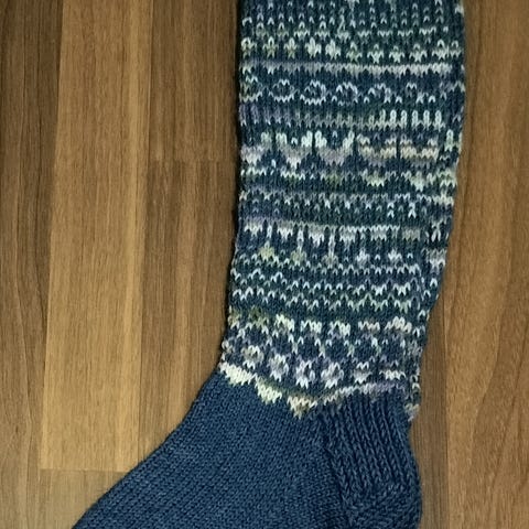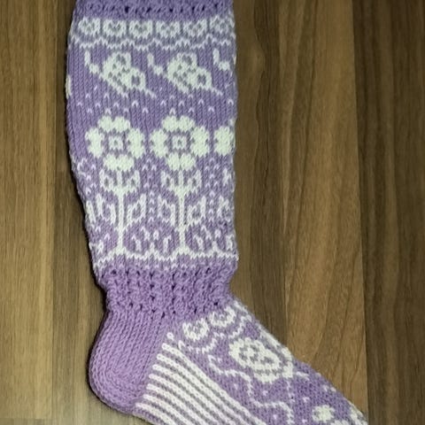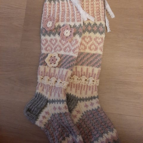 Pitkävartiset, käsin kudotut villasukat kirjoneuletta, konepestävästä langasta. Sukan koko on noin 40. Varren pituus kantapään alaosasta yläreunaan n. 45cm ja teräosan pituus n. 26cm
