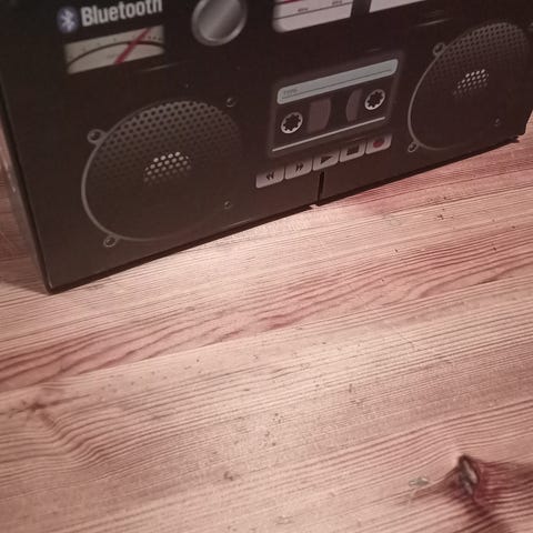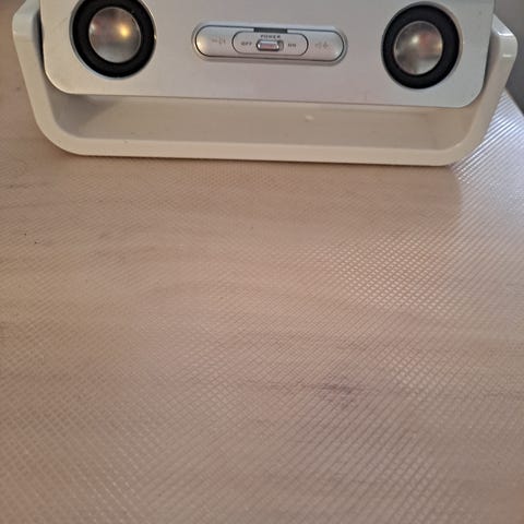vanha mutta toimiva bluetooth kaiutin. virtajohto hukassa mutta toimii AA paristoilla. paristokotelon kansi puuttuu.