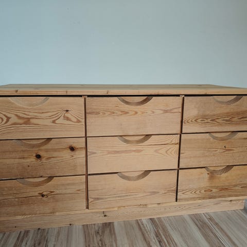 Puinen Lundia laatikosto. Laatikosto on puuta ja ehjä ja on neljällä pyörällä. Laatikostossa on käytön jälkiä, eli pieniä painaumia ja jälkiä. Laatikoissa on pohjalla joitakin jälkiä. Ne ehkä saa pois laatikoiden pohjalevyistä jos hankaa oikeilla aineilla.
