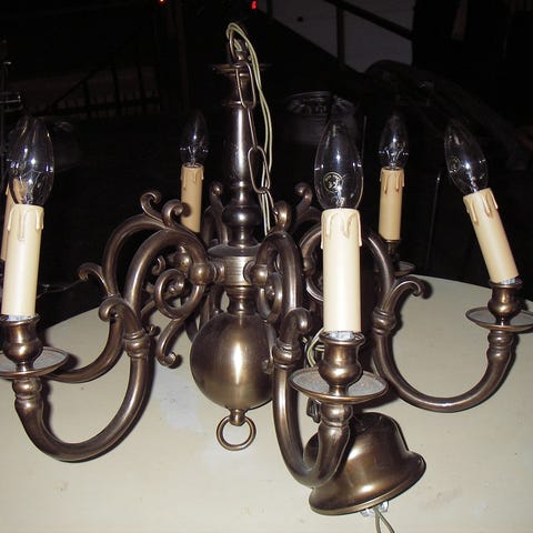 Vanha, 6-haarainen kattokruunu kynttilälampuin.