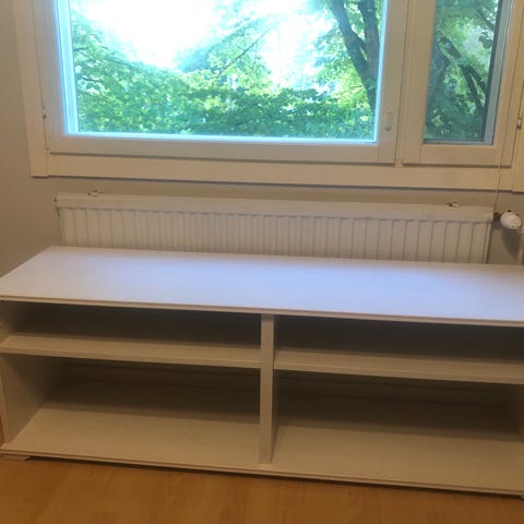 Kohtalaisen hyvässä kunnossa oleva pieni Ikean tv-taso.(Ei valmisteta enää). 4 hyllyä ja liukuovi, jossa kulma vähän lohjennut (kuva) Valmistettu kalustelevystä, metallijalat.