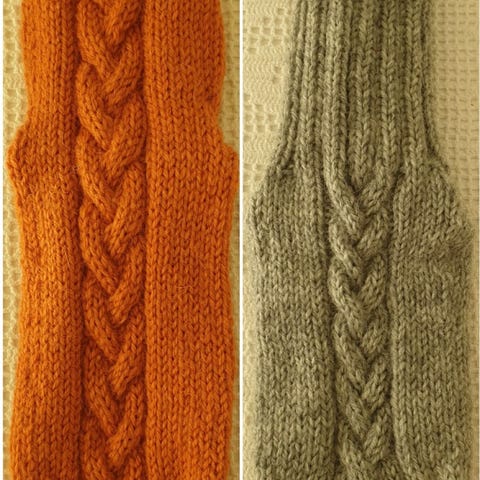 Ruskean sävyiset, pitkävartiset villasukat kirjoneuletta. Varren pituus kantapään alaosasta yläreunaan n 35cm ja sukan teräosan pituus n. 21cm. Sopii noin 34-35 kokoiseen jalkaan. Konepesun kestävästä langasta.