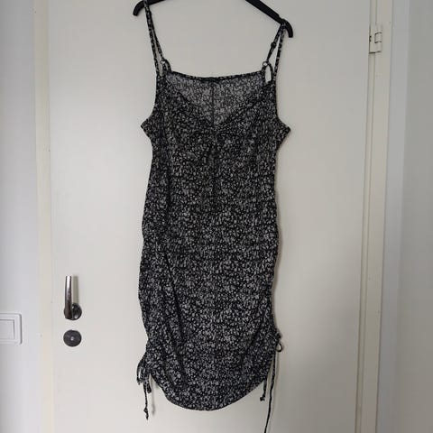 Kerran käytetty ja pesty, hyväkuntoinen pitkä ja löysän mallinen raidallinen/eläinkuosinen kesämekko. Helmassa halkiot. Koko- ja materiaalilaput leikattu irti, mutta kangas on melko kepeää ja aavistuksen läpikuultavaa ja joustaa hieman.