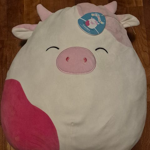 Kuvanmukainen uudenveroinen ja käyttämätön Squishmallows Ronnie (Lehmä). Mukana tuotekortti.