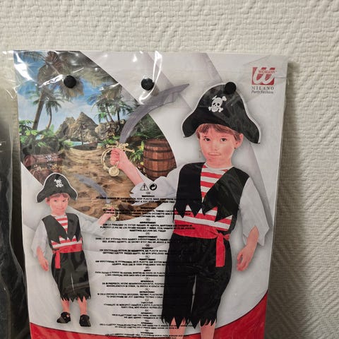 Myydään siistikuntoinen ja ehjä merirosvo-asu. Housut, paita, irrallinen liivi ja silmälappu.