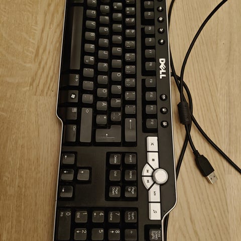 Dell-näppäimistö, musta väri, langallinen USB-liitännällä. Soveltuu tietokoneen näppäimistöksi. Täysikokoinen malli, sisältää numeronäppäimistön.