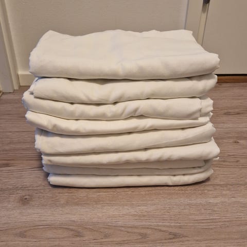Liinat pesty juhlien jälkeen. Silittäminen jää ostajalle. Kyseessä kissatalous, joten vaikka liinat on pesty ja pidetty kissojen ulottumattomissa, mukaan saattaa tulla yksittäisiä karvoja.