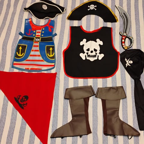 Kapteeni koukku / Jake merirosvo rooliasut / roolipuvut, molemmat kokoa noin 104.