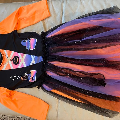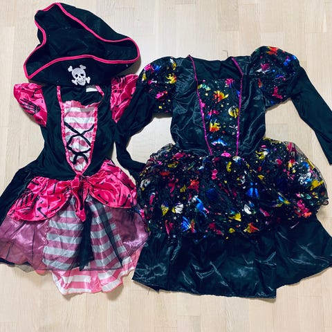 Lasten kaunis halloween teemainen noidan mekko koossa M. Kangas on tosi venyvää ja pehmeää ja täten mukava päällä. Edessä on hieman korsetin kaltainen solmittava osa ja hihoja voi oletettavasti pitää kahdella eri tapaa. Mekon kiiltävien ”nahka”osien pinta on kulunut, mutta kunto on muuten tosi hyvä.