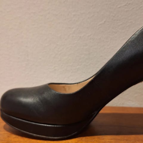 Toisen kengän kärjessä pienenpieni kuluma, jonka halutessaan voi lankata piiloon. Ei erotu kuin läheltä katsoessa. (Kuva)