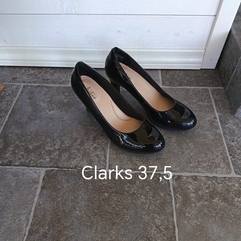 Clarksin puisilla kiilakoroilla varustut mustat, nahkaiset korkokengät. Säädettävät tuplaremmit ja pitävä pohja.