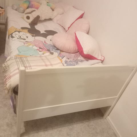 Valkoinen sänky. Laatikot sängyn alle.