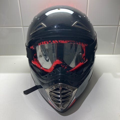 Hieman kulunut, joistan kohti maalilähtenyt, mutta siitä jollekkin mopokypärä ja lasit. Mieluiten haku