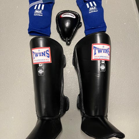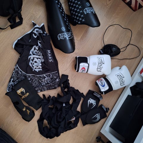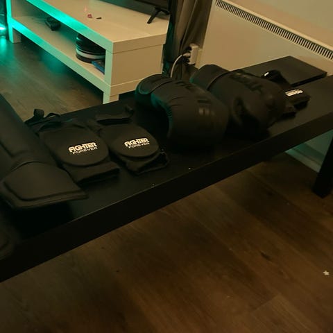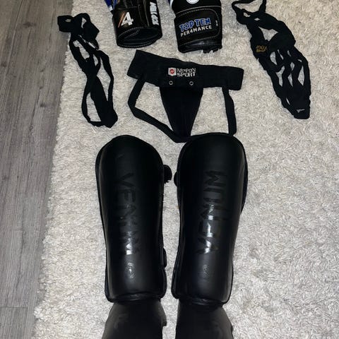 Myydään thainyrkkeilyyn soveltuva varuste setti. Suojia ei hirveesti ole käytetty eli kunto on tosi hyvä.