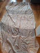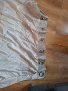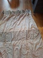 4kpl Jotex:sta ostetut verhot, koko 140x220 cm, harmaa/beige/valkoiset raidat. Kangas kuultaa lävitse valoa. Verhoissa on metalliset silmukat ripustusta varten. Verhot on pesty, mutta kaipaavat silitystä. Taloudessa ei ole eläimiä. Kuva missä Verho paikoillaan on otettu hämärässä joten näyttää siinä tummemmalta mitä todellisuudessa on päivänvalossa.