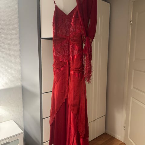 Eri tilaisuuksiin muuntautuva hame. Asukokonaisuuteen kuuluu hamekankaasta tehty pussukka, vyö sekä hihat. Hametta voi pitää vanteellisen alushameen kanssa tai ilman. Sopii vanhojenpäivään, hääpuvuksi tai pitkäksi iltapuvuksi muuhun juhlaan. Koon puolesta joustava, sillä nyöritetyn selän vuoksi sopii S - XL kokoiselle. Ompelijan tekemä uniikki kappale. Kerran hääpukuna käytetty. Kangas on samettia. Pesetetty pesulassa käytön jälkeen.