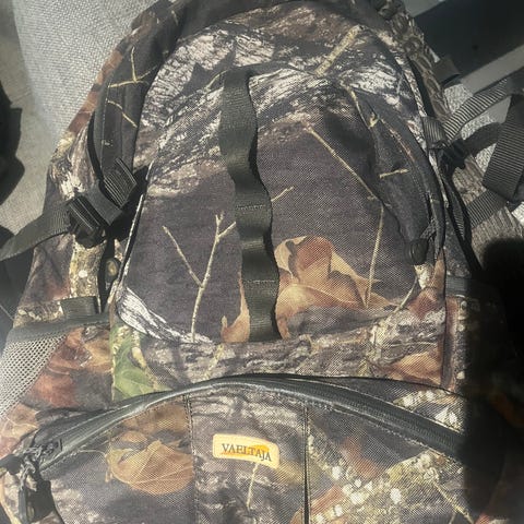 Vaeltajan maastokuvioinen reppu/laukku. Laukussa on vetoketjullinen pääosio ja useita taskuja. Materiaali kestävää kangasta, sopii esimerkiksi retkeilyyn. Laukkua voi kantaa myös reppuna. Hinta 20 euroa.
