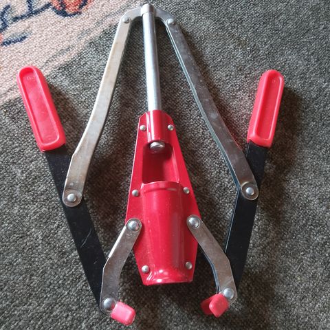 Punainen ”salkku” pahvivälilehdillä ja klipsillä.