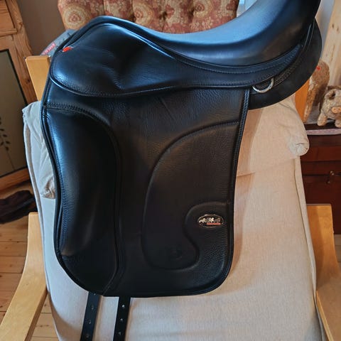 Hyvin avoin, taakse leikattu säkätila. Istuin on 18″, mutta vastaa n. 17-17,5″. Etukaari joustaa ja muotoutuu hevosen leveyden mukaan, foam-paneelit.