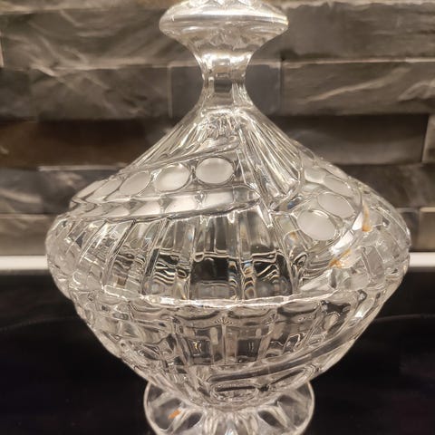 Upea jalallinen juustokupu tarjotin. Kupuosa kristallia sydänkaiverruksilla,jalka lasia. Kork 24 cm halk 14,5 cm