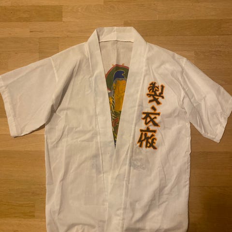 Ehjä siisti ehkä käyttämätön tai itse en ole käyttänyt. Kimono/takki. Juhliin naamiaisiin tms lapussa koko L mutta on myös M kokoiselle hyvä. Valmistettu Japanissa. "Solmu" napitus. Pituus noin polveen. Mieluiten nouto Villähde