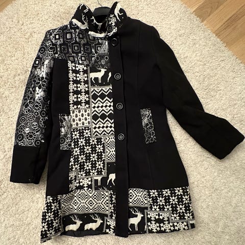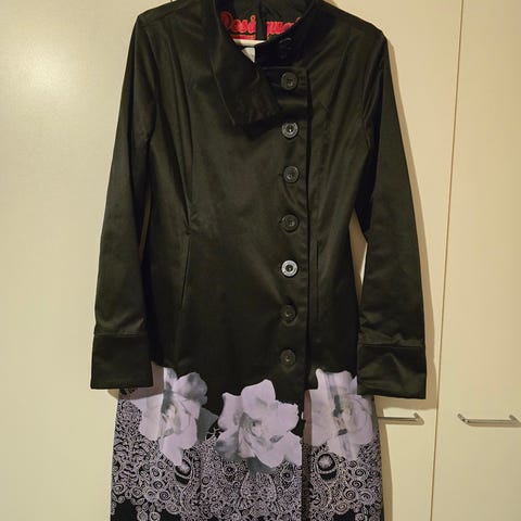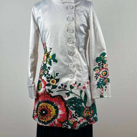 Tämä asymmetrisesti suljettava takki on täynnä yksityiskohtia – brodeeraukset, sisävuoren kukkakuviot ja korkea kaulus tekevät siitä taatusti katseita keräävän.