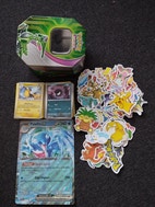Uudet Pokemon kortit,tarrat+ hyväkuntoinen peltirasia