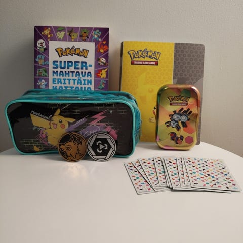 85 kpl uusia Pokemon tarroja,suuri Pokemon kortti, Pokemon kortteja 135 kpl, sekä erinomaisessa kunnossa oleva peltirasia,korttien säilytykseen. Lisäkuvia saa pyytämällä.Tästä upea setti vaikkapa lahjaksi. Hinta sisältää postikulut ärrä paketilla.