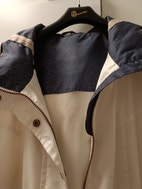 Myydään kiva valkoinen torstain takki hupulla sisäpuoli sininen verkkovuori säädettävä vyötärö nauha K.46.Hyvä kuntoinen siisti.