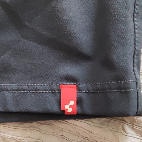 Takana kuminauha ja sivuilla sisäpuolella vielä erilliset pätkät kuminauhaa jotka kiristetään tarranauhalla vyötärökaitaleeseen. Vetoketju on normaalia pidempi niin helpottaa pukemista ja riisumista. Vetoketjussa nauha helpottamassa käyttöä. Ei nappikiinnitystä vaan hakanen.