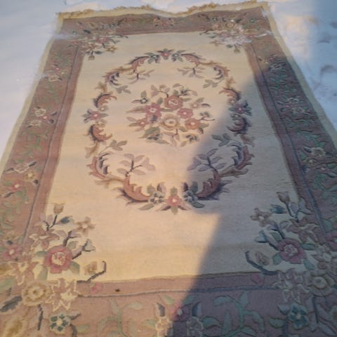 Muuten hyvässä kunnossa oleva villamatto mutta toisessa pitkässä sivussa lankoja auki(kuva) ja pesua vaille. Otettu ois käytöstä suoraan lattialta.