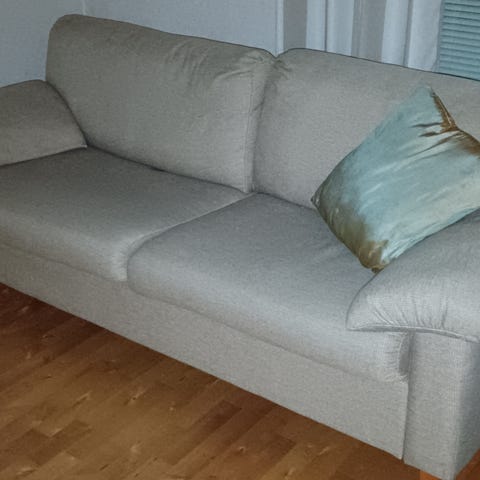 Sohvan mitat 90cm x 210cm. Sohvatyynyjen päälliset irrotettavat ja konepestävät. Sohva ryhdikäs ja hyvä istua.