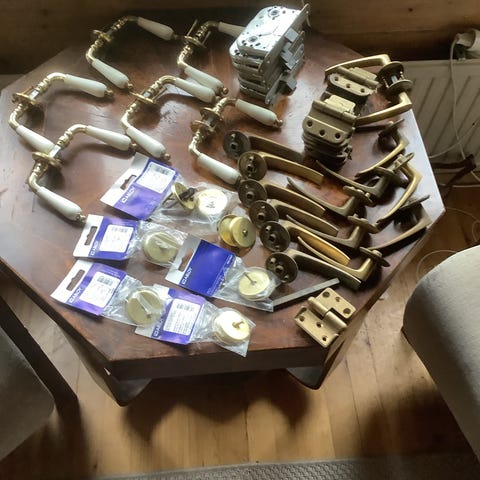 Ikkuna- ja ovipainikkeet sekä lukot, eri kokoisia ja materiaaleja, sopivat ikkunoihin ja oviin. Sisältää kahvoja ja lukkoja, jotka on tarkoitettu kiinnitettäväksi ikkunoihin ja oviin turvallisuuden ja käytettävyyden parantamiseksi.yhteensä 20€