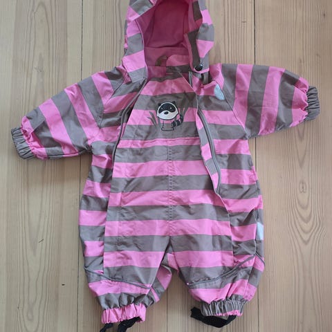 Hyväkuntoinen ohutvuorinen tuplavetoketjuinen välikausihaalari koko 56. Ehjät jalkalenkit ja vetoketju, irrotettava huppu.