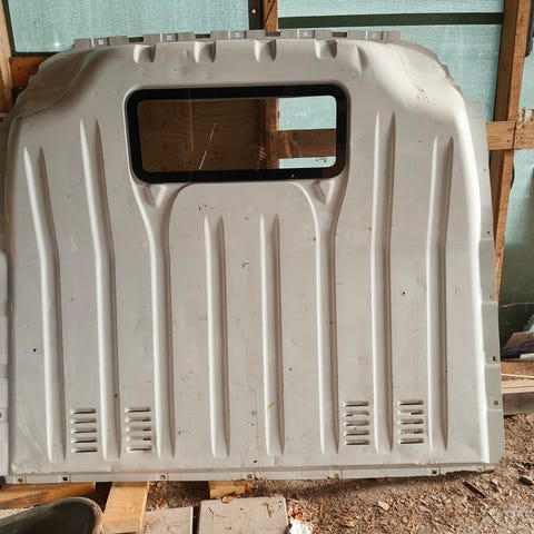 Retkeilyauton rakentamisen yhteydessä poistettu ikkunallinen välieinä, tavaratilan puolella äänieristys (Citroen Jumper vm.2014).