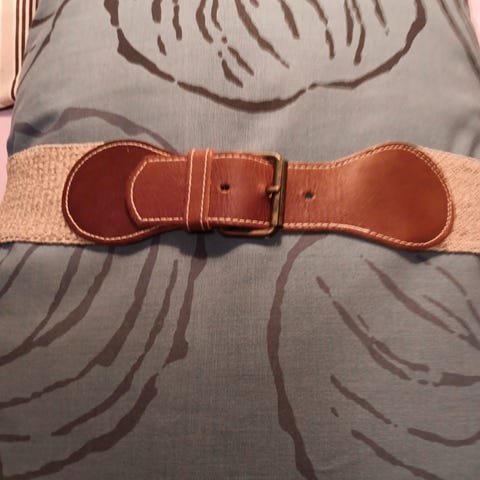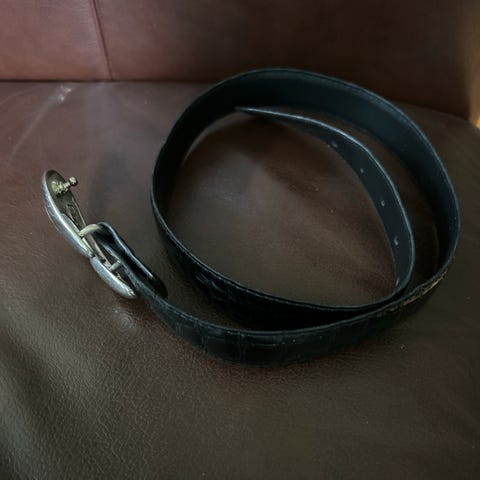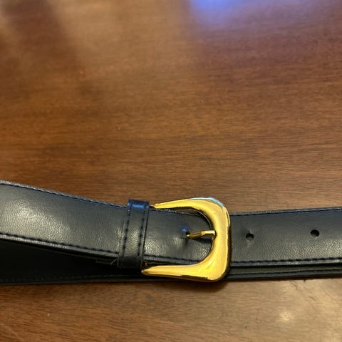 Musta naisten vyö, valmistettu nahasta (tai tekonahasta), kiiltävä pintainen, jossa on metallinen solki. Vyö on säädettävissä useilla rei'illä ja sopii eri kokoisille vyötäröille. Pituus 94cm, leveys 2,5cm.