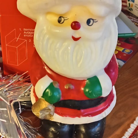 Kuvan joulukoristeet.Verkkovirralla toimiva joulupukki, kuusenkynttilänpidikkeet jotka ovat priinmakuntoisia,Aarikan kynäteline jossa kasvojen kohdalla kynää, pidike vaikkapa maitopurkille sisällä tummentumaa,sekä puinen punainen kynttilänjalka jossa on halkeamaa yhdessä kynttilän kupissa.Voin myydä myös erikseen.