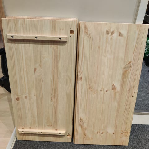 Nyt purettuna osiin, paitsi laatikot ja kaappi ovat koottuina.