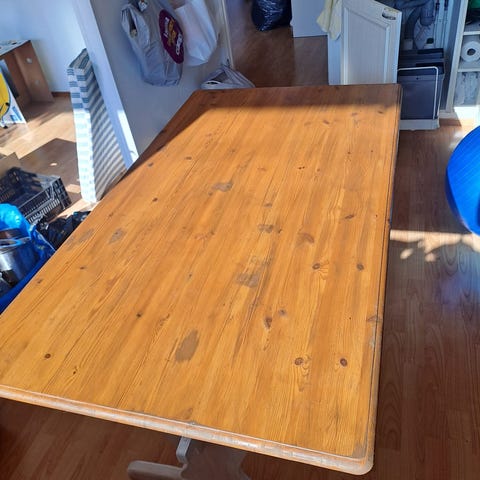 Vanhasta pöydästä itse kunnostettu ruokapöytä. Täydellinen pieneen tilaan kapeutensa vuoksi. Pöydän alle asetettu tukipuut ja täten yksi jatkopala kokoajan kiinni pöydässä. Yksi jatkopala irrallaan vielä, mutta tätä ei ole maalattu ja tukipuut tulisi irroittaa jotta tuon saisi käyttöön. Maalattu ja käsitelty valkoiseen taittavalla puuvahalla. Hiottavissa ja maalattavissa uudelleen. Täyttä puuta.