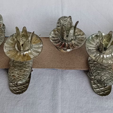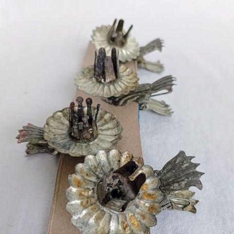 Kuusi aitojen kynttilöiden pidikettä kuuseen. Paljon patinaa, käyttökuntoisia kuitenkin. Yhteishintaan 7 e. Nouto Itiksen vierestä tai postikulut S-pakettina ostajalle. Nopea postittaja. Yhdistän paketit pyynnöstä. Katso muutkin ilmoitukseni, paljon retroa ja vintagea sekä vuosien varrella keräiltyä erikoista tavaraa muuttomyynnissä. Myös muita vanhoja kuusenkynttiläpidikkeitä, joukossa toinenkin aivan samanlainen sarja.