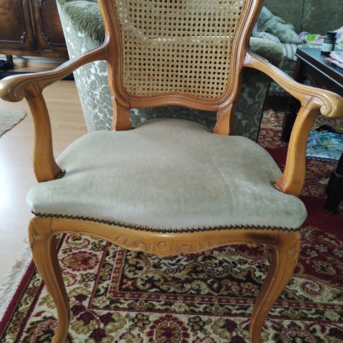 Selkänojassa, etukulmassa ja etuosassa jälkeä nahassa, muuten siisti.